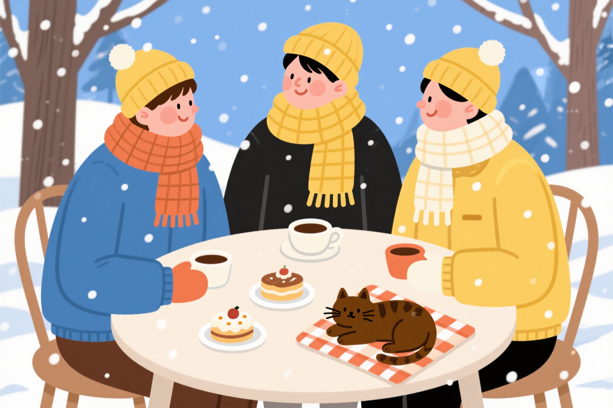 作品描述:扁平温馨风格,立冬插画,三人着冬装(黄帽、围巾)围坐圆桌,桌上咖啡点心,猫咪躺格纹垫,背景飘雪,氛围温暖