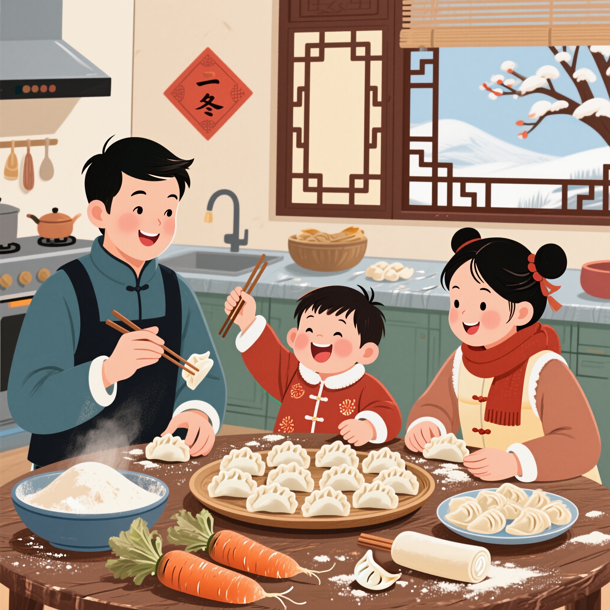 作品描述:亲子民俗风格,立冬插画,一家三口围桌包饺子,孩子兴奋举筷子,桌上摆着萝卜、面粉,背景中式厨房,传统氛围感拉满