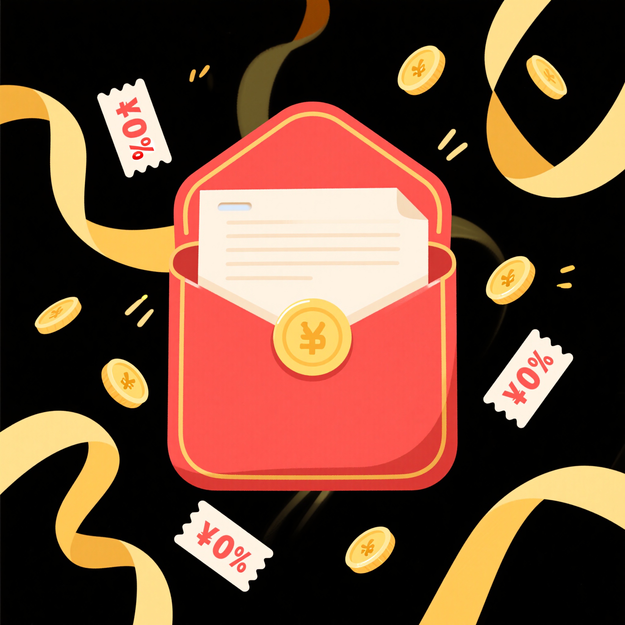 作品描述:电商促销插画,红色红包主体,内有空白纸张,周围散落金币、优惠券,金色飘带装饰,文案留白,扁平插画风格,正方形构图,背景黑色