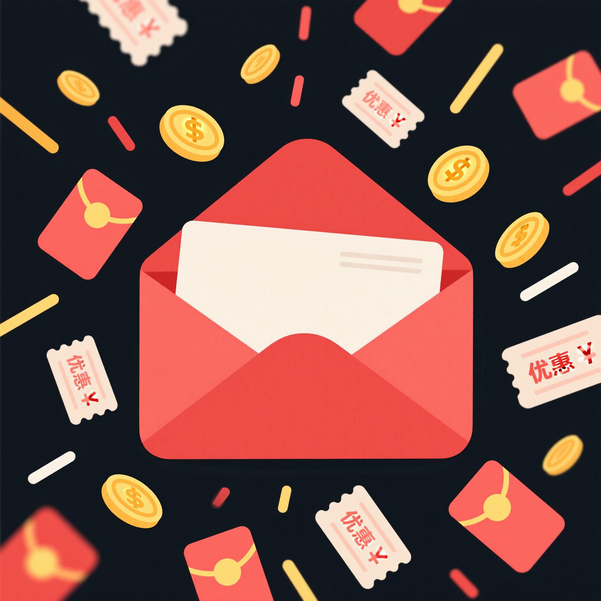 作品描述:红包促销插画,红色信封主体,信封打开露出空白卡片,周围飞舞金币、红包、优惠券,无文案,扁平插画风格,正方形构图,背景黑色