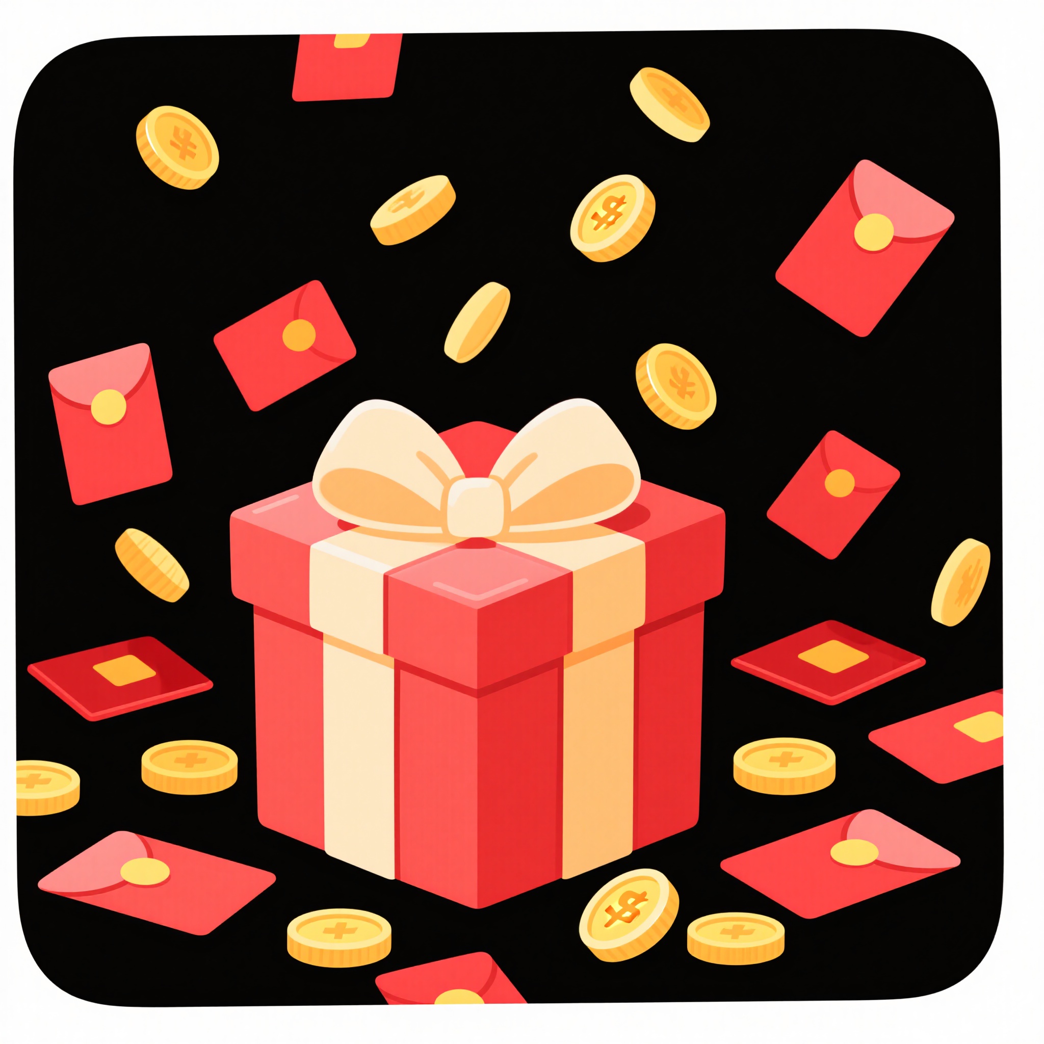 作品描述:促销活动红包,红色礼盒主体,顶部蝴蝶结,周围散落红包与金币,扁平插画风格,方形构图,背景黑色