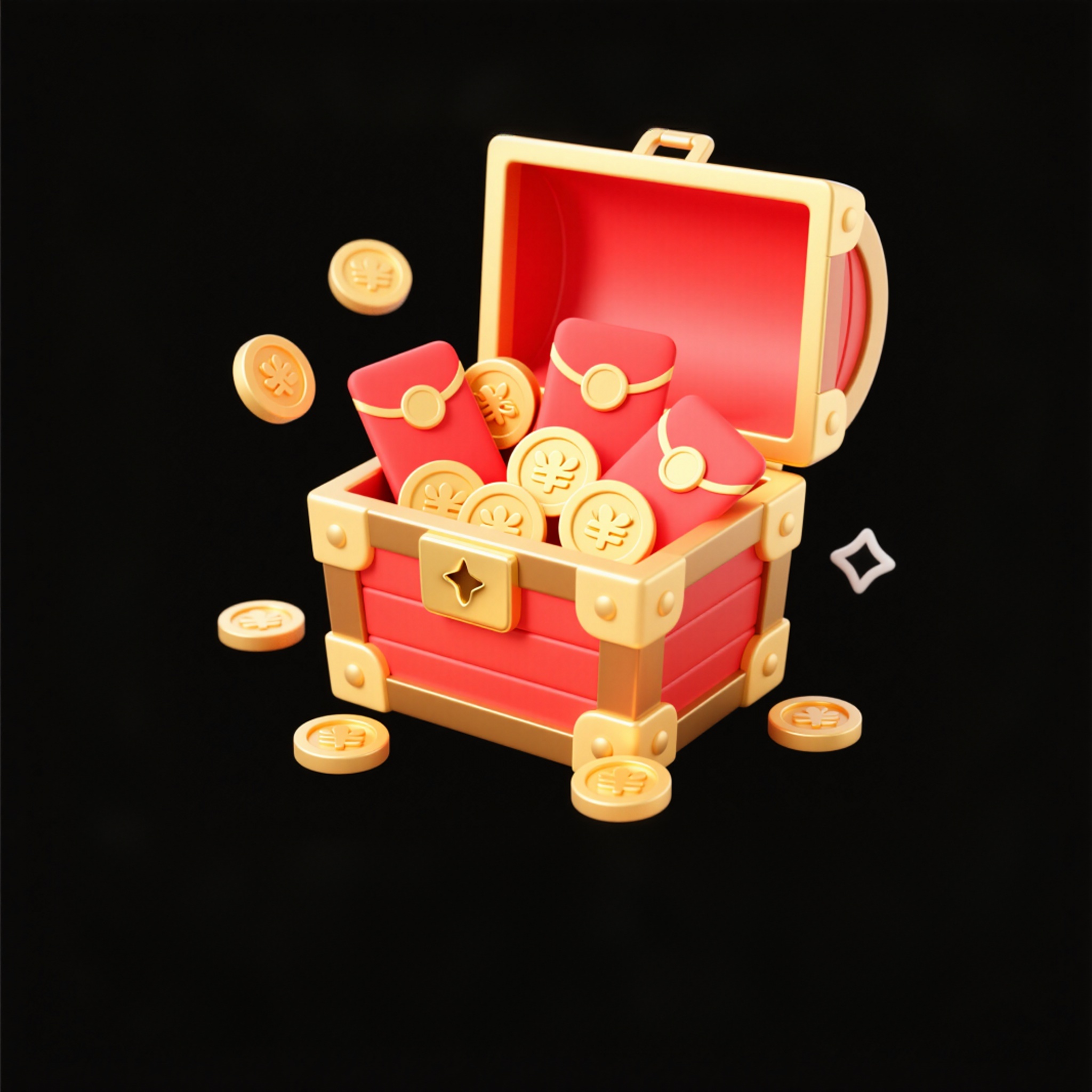 作品描述:红包主题图, 打开的红色宝箱中装满红包和金币, 宝箱底部有金色长条区域可用于添加信息, 卡通风格, 居中构图, 简洁明亮,背景黑色
