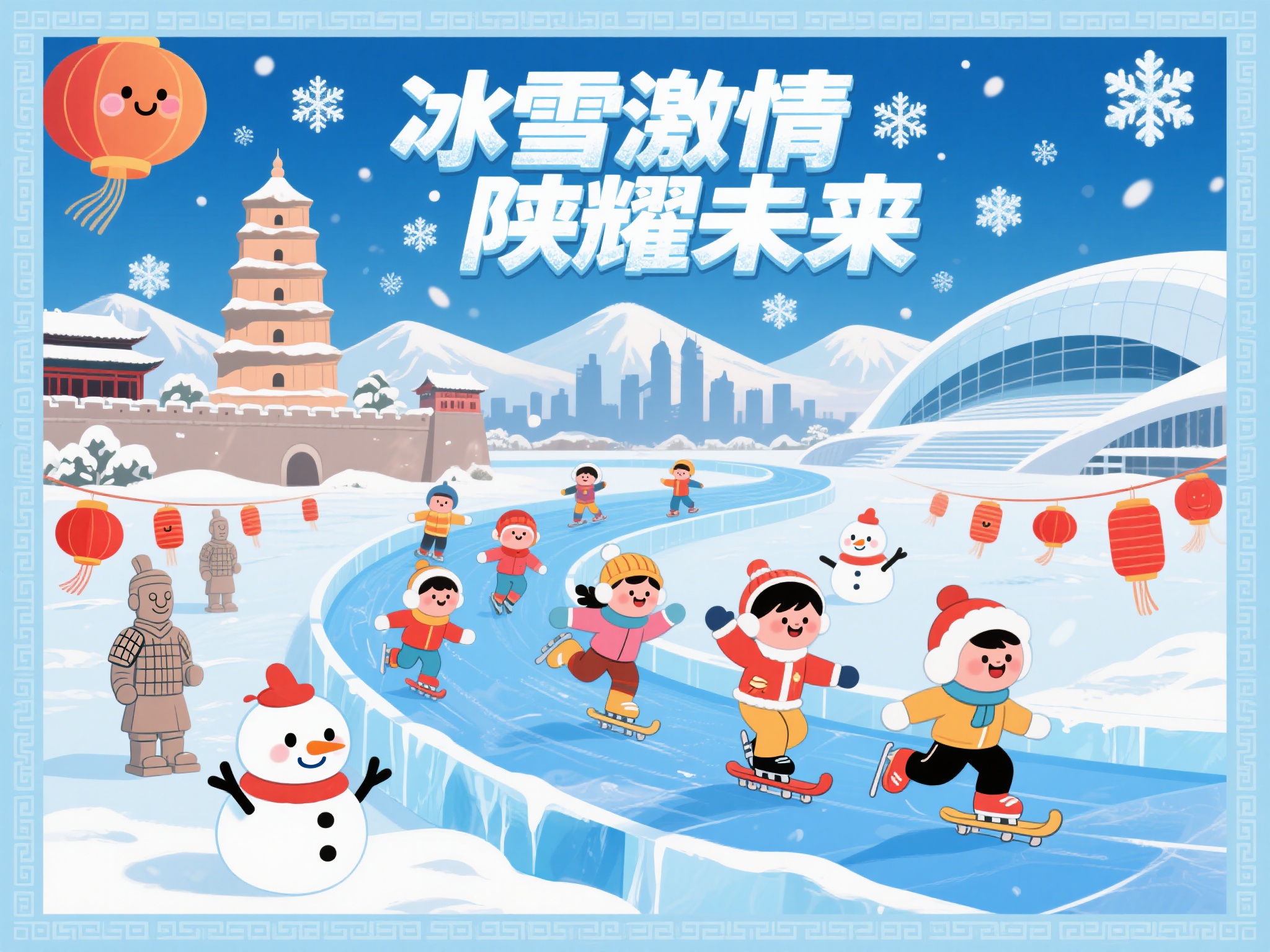 3. **远景(主题升华):** 背景是简洁的陕西天际线剪影,融合了**覆盖白雪的大雁塔、西安城墙与现代流线型的冰雪场馆**,远处是绵延的秦岭雪山轮廓。