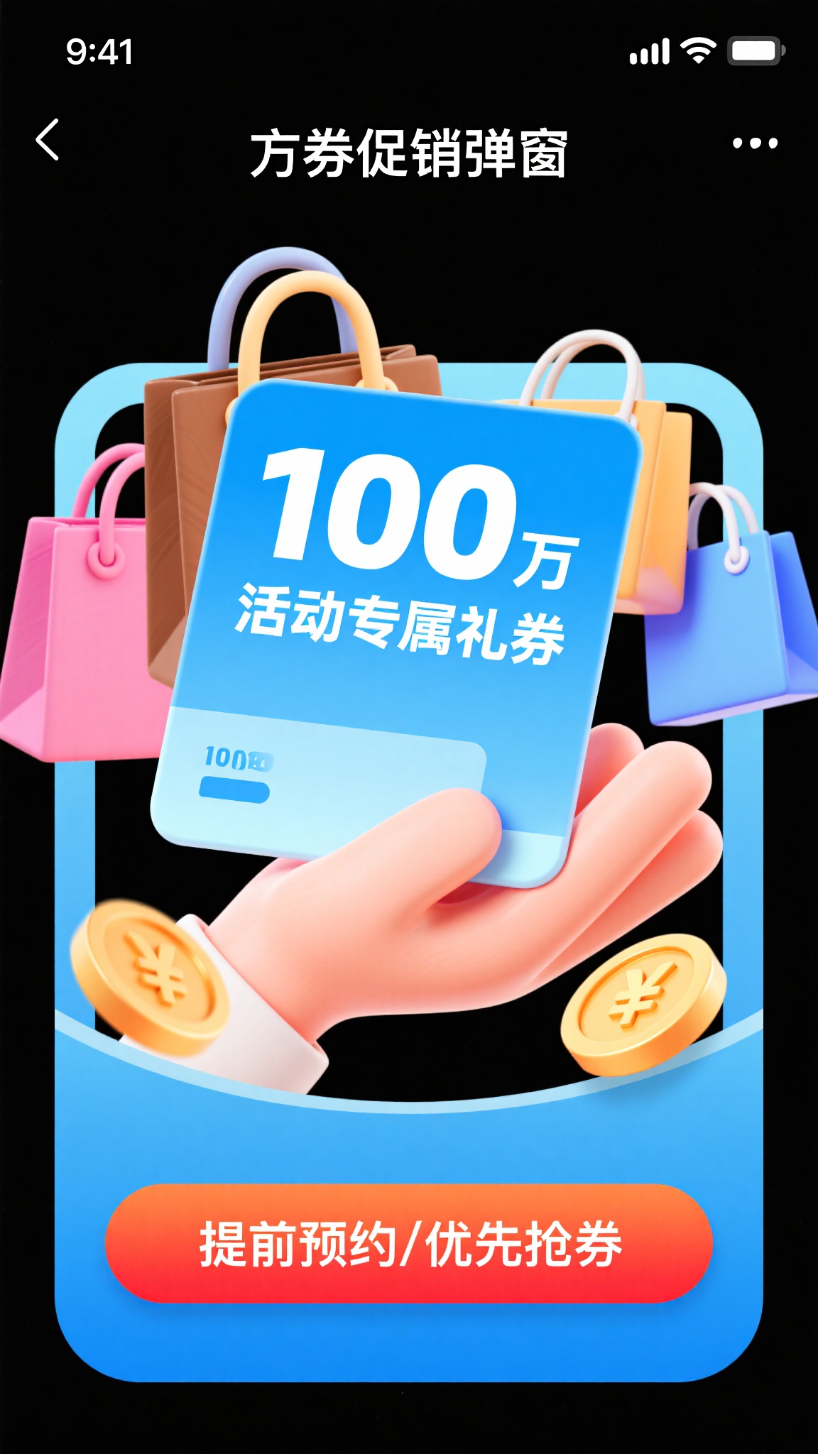 作品描述:清新蓝调风格促销弹窗, **载体**:蓝渐变卡片(微弧圆角,嵌入以下所有内容):卡通手掌托着蓝底礼券卡片,“100 万 活动专属礼券” 白字,周围环绕质感分明的购物袋(粉 / 棕 / 蓝)、金币,底部橙红 “提前预约 / 优先抢券 ”按钮。背景黑色,突出弹窗醒目与互动感。
