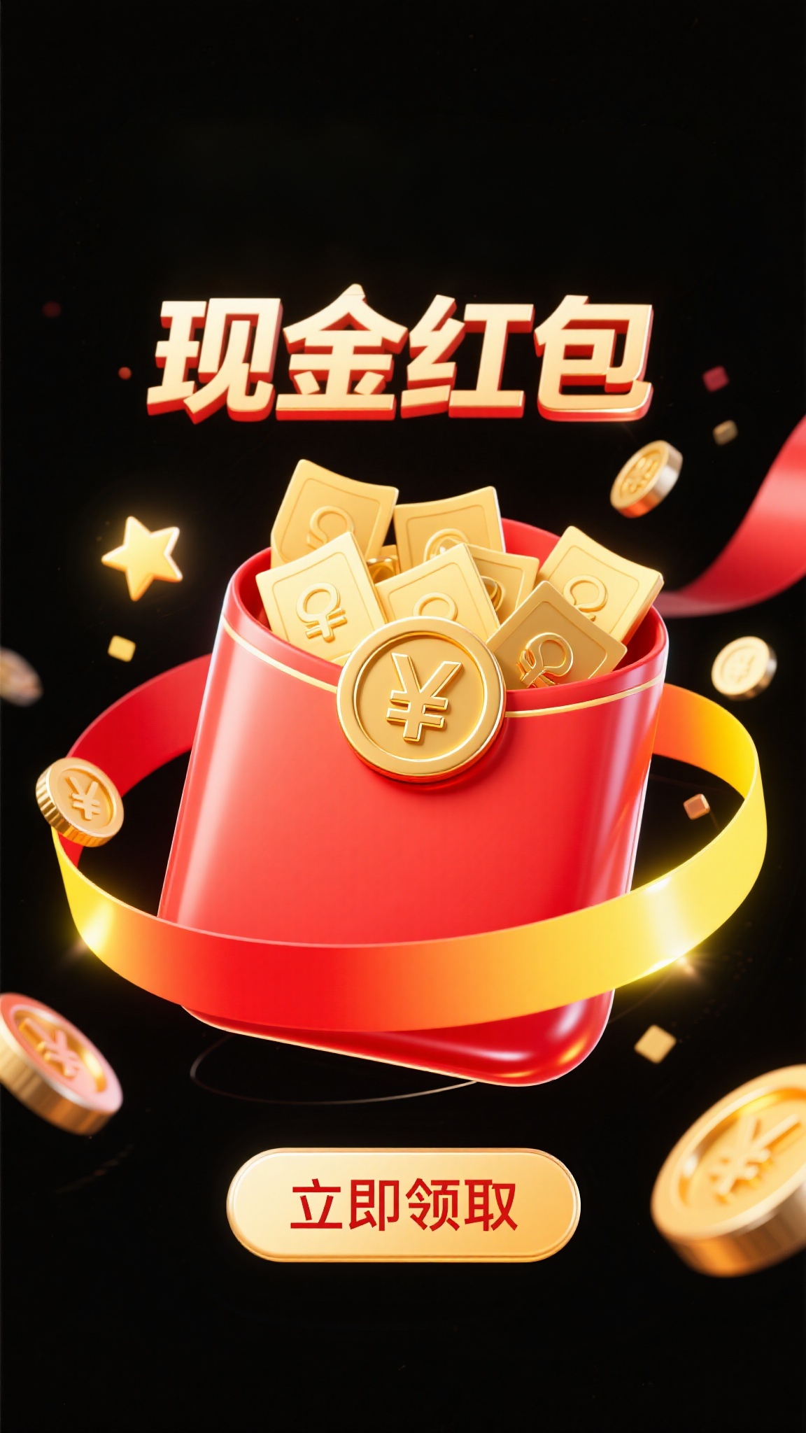 **核心载体**:大红色渐变立体红包(表面带金属光泽质感,边缘叠加高光轮廓,整体呈‘膨胀感’ 3D 形态,仿佛包裹满额现金),