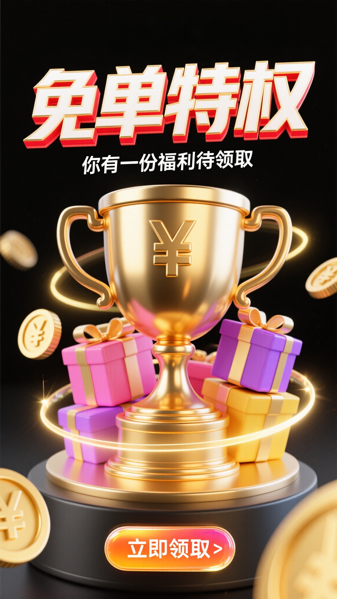 细节元素:彩色礼物盒 粉 / 紫 / 金等糖果色,带精致丝带装饰,如礼盒堆叠于奖杯内 强化‘福利丰富’感知,通过色彩对比吸引注意力