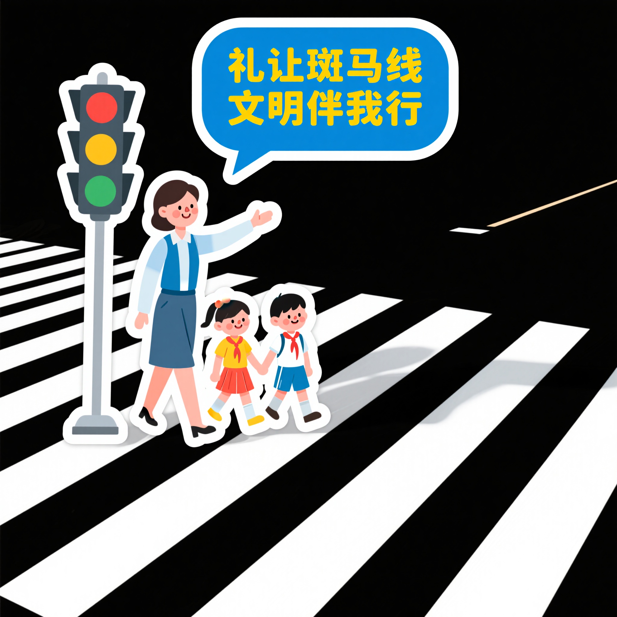 作品描述:师生斑马线 “礼让斑马线文明伴我行” 贴纸 风格:蓝黄对话泡风,元素含老师(指挥手势细节)、孩子(牵手神态)、交通灯;文字 “礼让斑马线 文明伴我行”。细节:斑马线的黑白纹理、孩子的服饰色彩、对话泡的立体阴影,背景黑色。用途:学校周边警示、斑马线文明宣传贴纸。