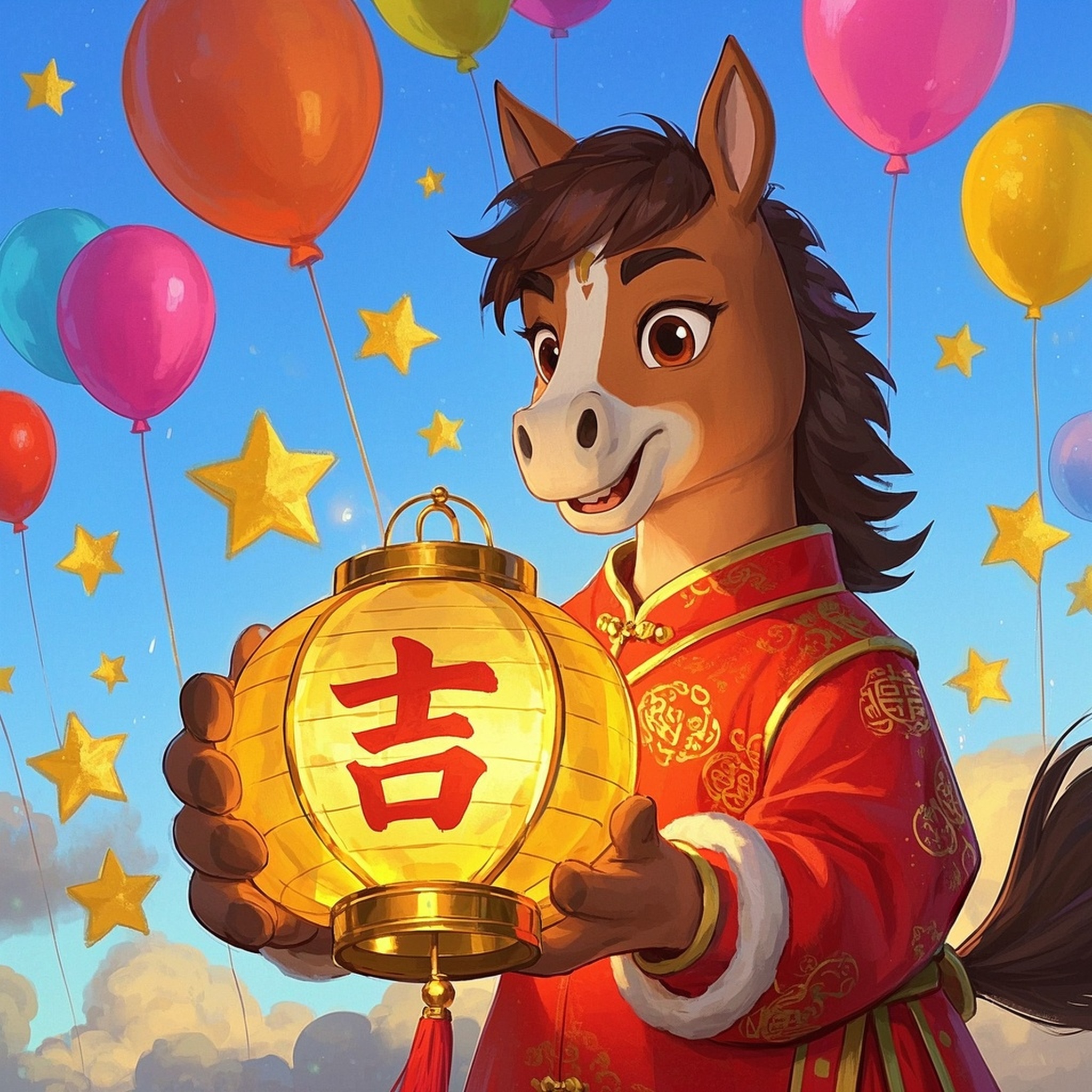 作品描述:画面中是一只身着红色中式服装的卡通小马,它双手捧着一个印有 “吉” 字的金色灯笼,周围环绕着彩色气球和金色星星,背景为蓝天,整体洋溢着喜庆的马年氛围
