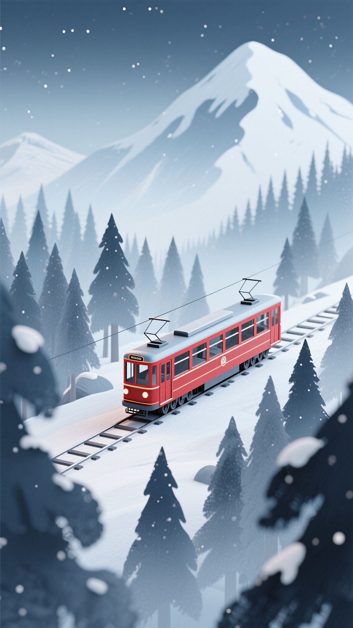 作品描述:3D 水墨风小雪插画,核心载体是蓝灰水墨森林,红色复古电车做每秒 8 帧缓慢行驶动效穿梭其中;背景是水墨雪山渐变。