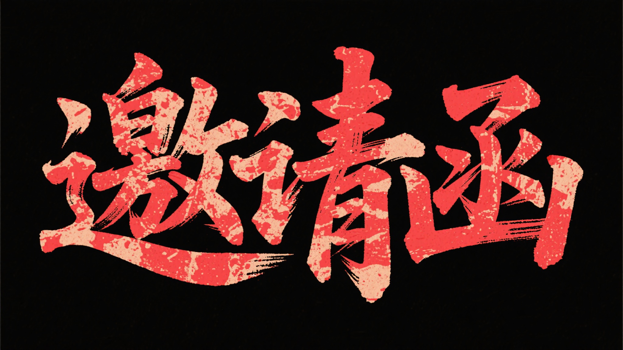 作品描述:红色做旧风格 “邀请函” 艺术字,字体带有粗糙的纹理效果,笔画边缘有斑驳感,整体呈现出复古且有质感的视觉,背景为黑色,适合用于具有怀旧氛围或传统风格的活动邀请。