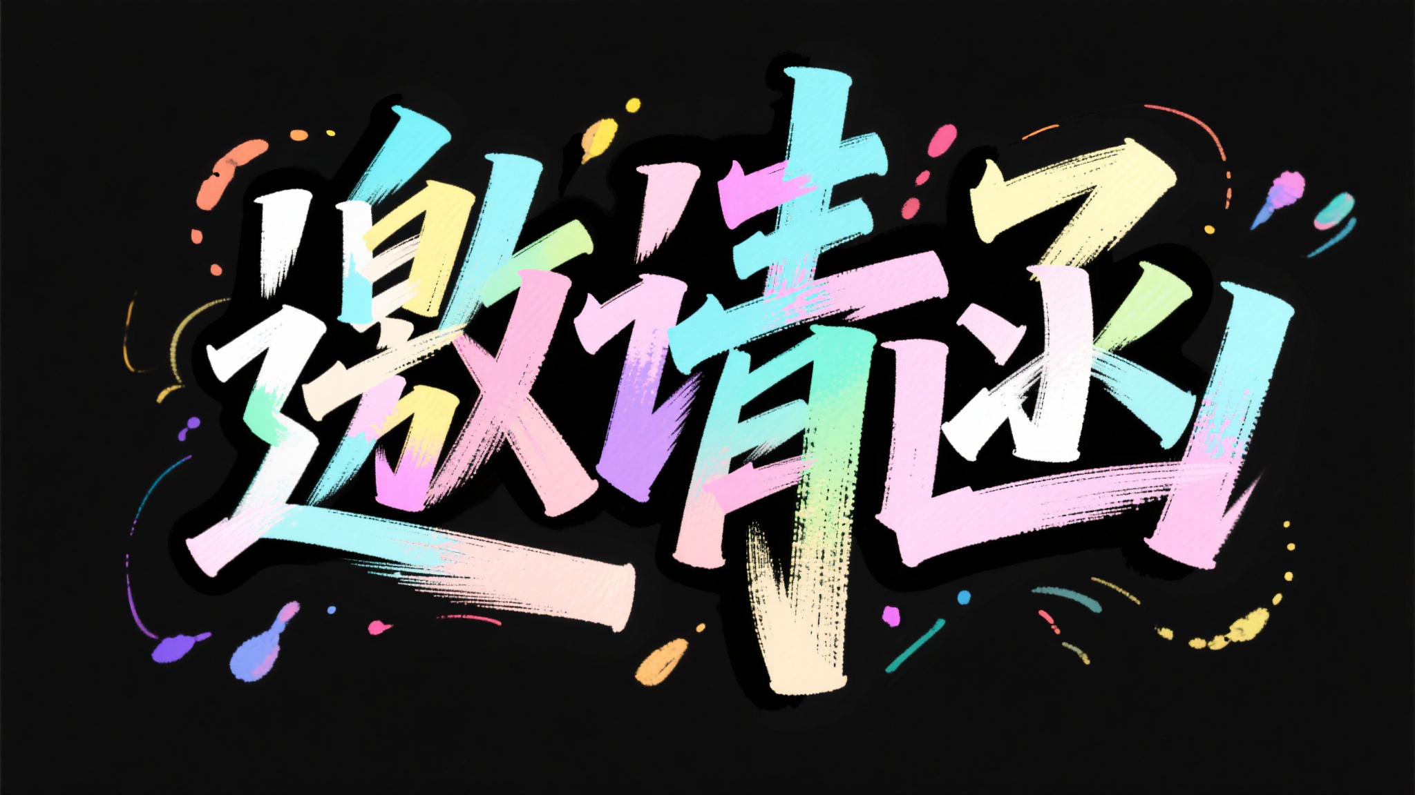 作品描述:手绘涂鸦风格 “邀请函” 艺术字,笔触自由随性,带有彩色墨水晕染效果,线条灵动活泼,仿佛是随性书写又充满创意的手写字体,背景黑色 ,适合潮流派对、青年社交类邀请。
