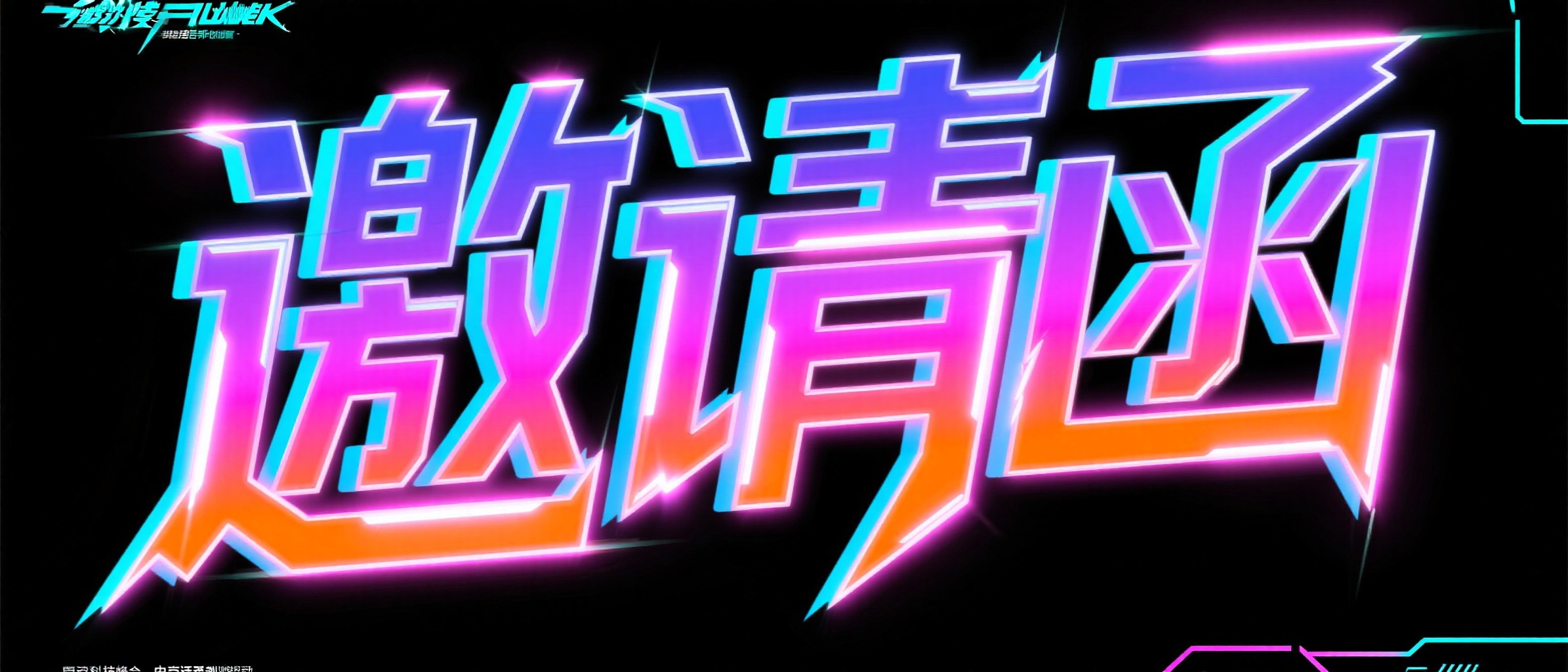 作品描述:赛博朋克风 “邀请函” 艺术字,字体融合霓虹渐变色彩(如蓝紫、粉橙渐变),带有金属光泽和发光线条,笔画边缘有科技感的毛刺或霓虹光晕,背景黑色,适合科技峰会、电竞活动类邀请。