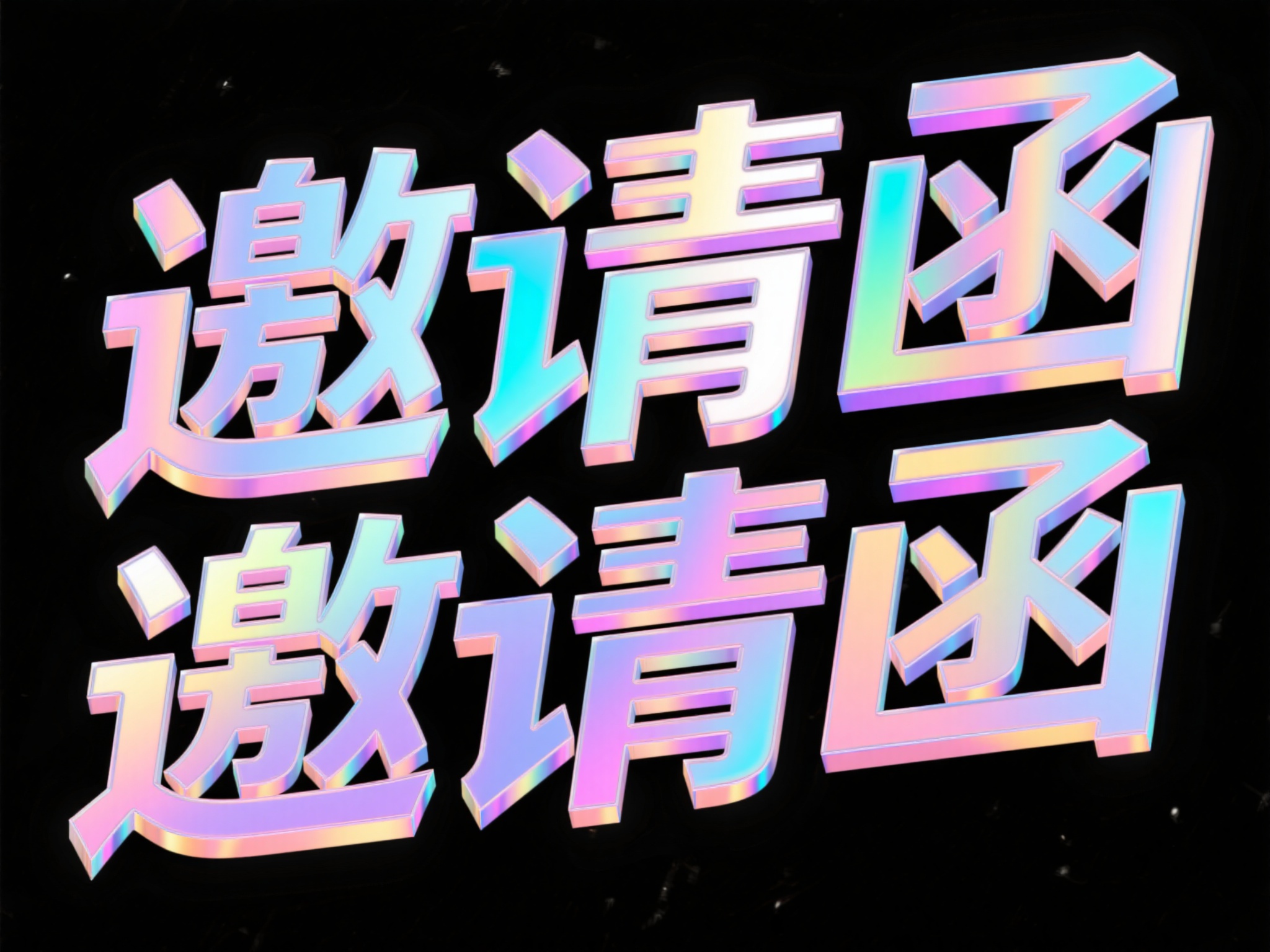 作品描述:全息投影质感 “邀请函” 艺术字,字体呈现出立体全息的视觉效果,色彩在不同角度有渐变变化,背景黑色,适配高端科技晚宴、未来主题展览类邀请。