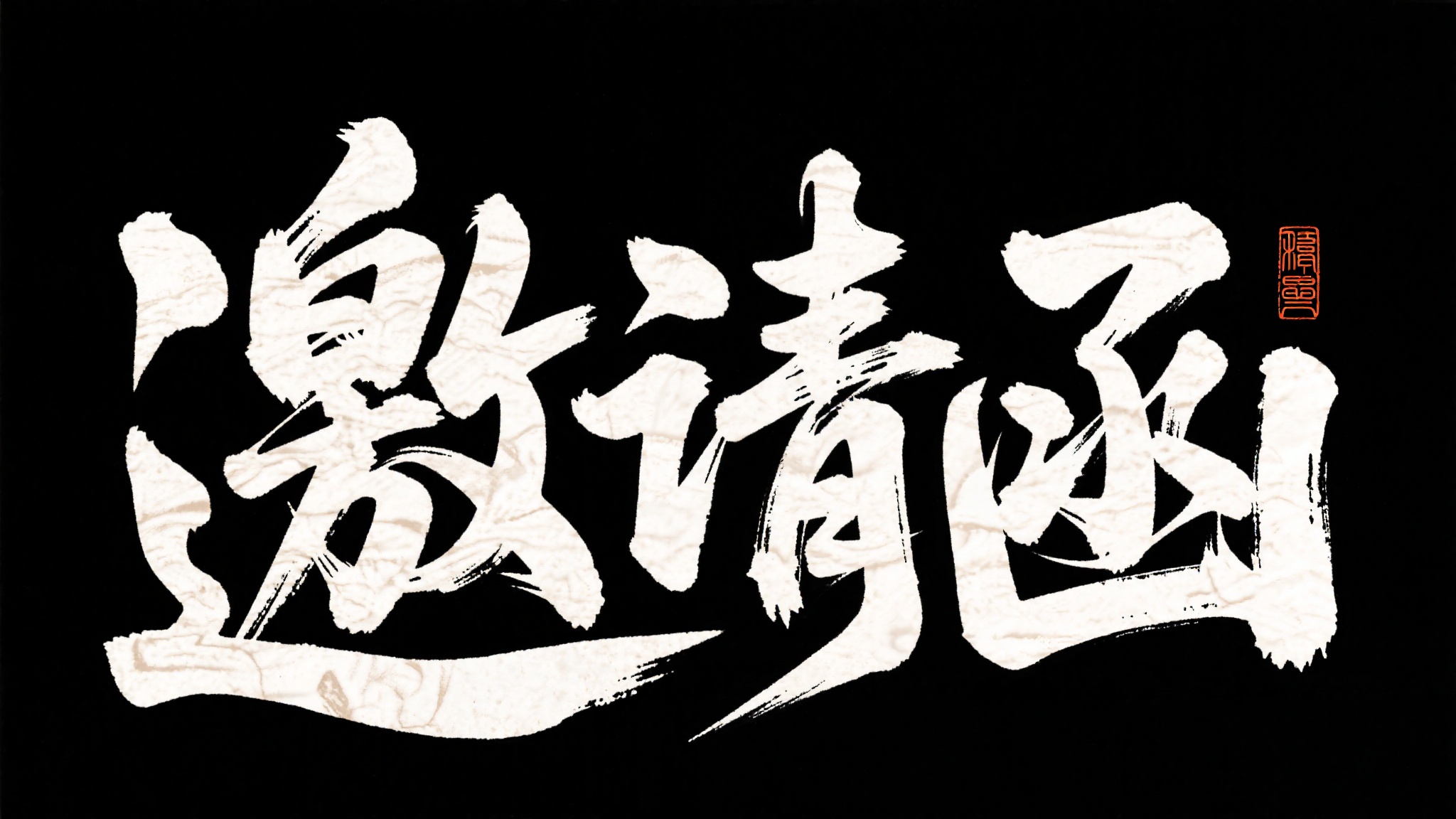 作品描述:水墨篆刻“邀请函 艺术字,字体以浓淡变化的水墨笔触呈现,结合传统篆刻的字形结构,带有古朴的印章纹理,背景黑色,适合中式婚礼、国风文化活动类邀请。