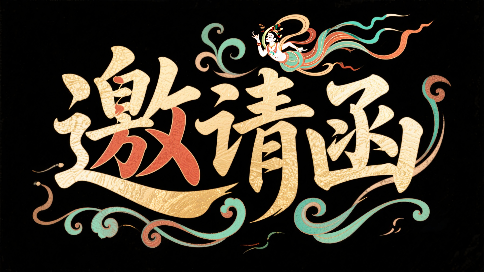 作品描述:敦煌壁画风 “邀请函” 艺术字,字体借鉴敦煌壁画的色彩(如土红、石绿、金色),笔画带有壁画的线条韵律和纹理,嵌入飞天、卷草等装饰元素,背景黑色,适配敦煌艺术展、国风盛典类邀请。