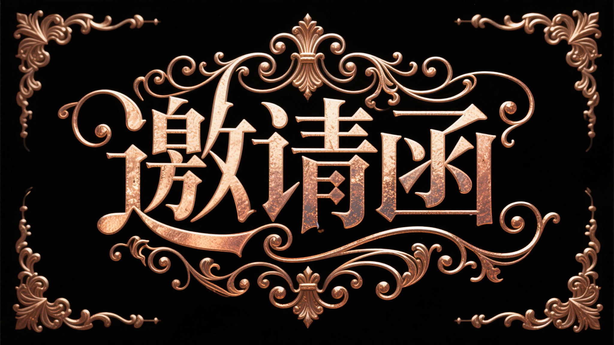 作品描述:哥特花体 “邀请函” 艺术字,字体采用欧式哥特式花体,笔画带有复杂的卷草装饰和金属浮雕质感,色彩为复古金或做旧铜色,背景黑色,适合欧式宫廷宴会、复古舞会类邀请。