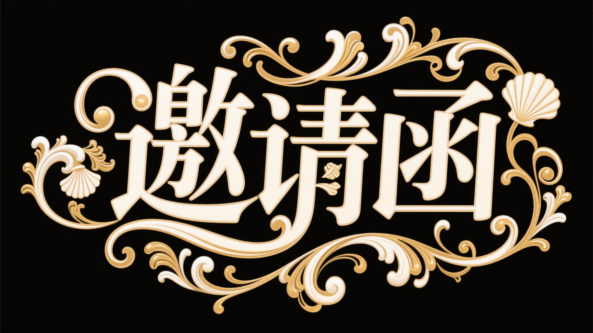 作品描述:洛可可风格 “邀请函” 艺术字,字体造型华丽柔美,带有大量卷曲的装饰线条和贝壳纹元素,色彩为奶油白与金色搭配,背景黑色,适配高端欧式婚礼、艺术沙龙类邀请。
