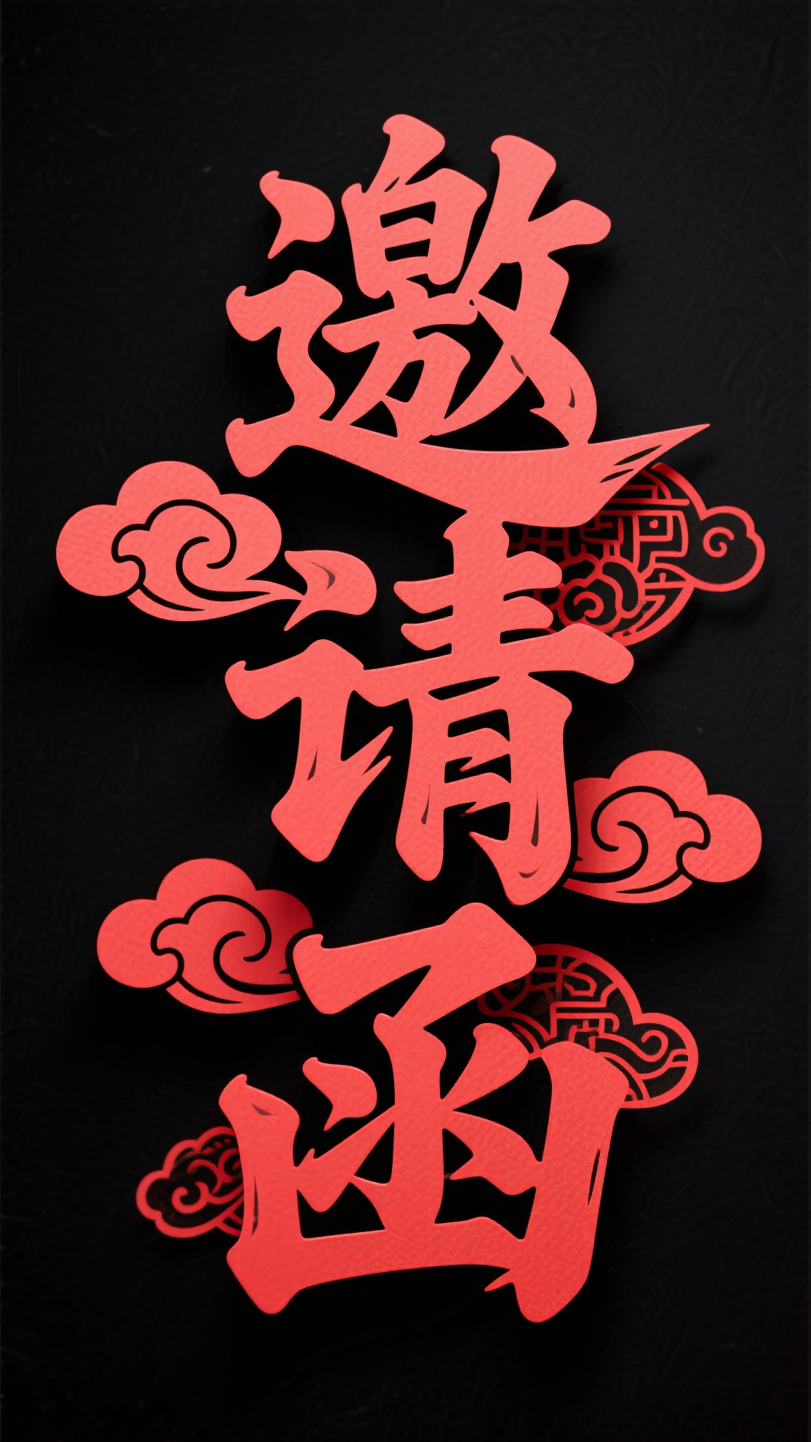 作品描述:国潮剪纸风格“邀请函”艺术字,红色为主色调,字体带有剪纸的镂空,结合祥云、传统纹样装饰,笔画边缘锐利且富有韵律,背景黑色,尽显中式传统与潮流融合的美感。
