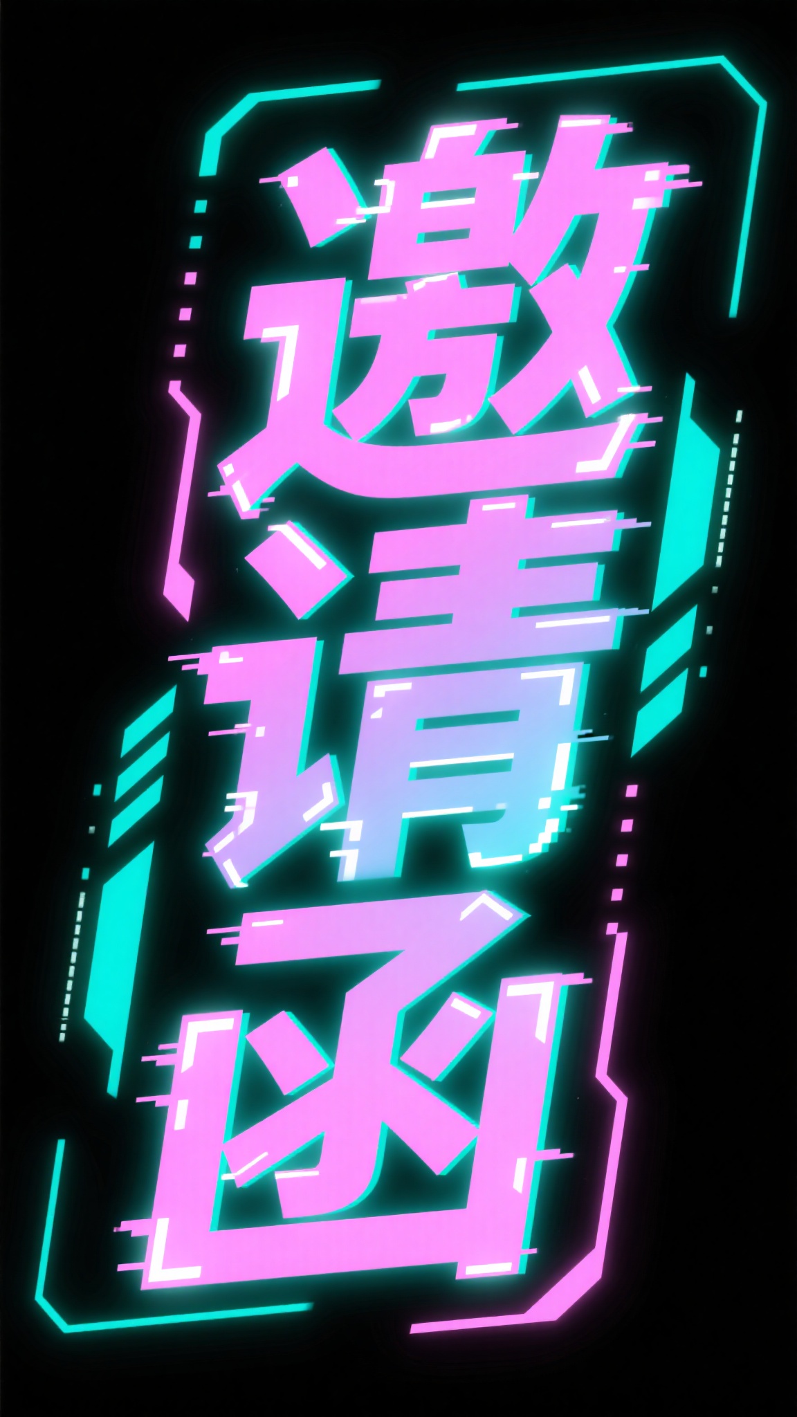 作品描述:霓虹赛博风格 “邀请函” 艺术字,采用粉紫、蓝绿渐变的霓虹色彩,字体带有科技感的发光轮廓与线条,笔画边缘有像素化或光效毛刺,充满未来感与潮流感,背景黑色。