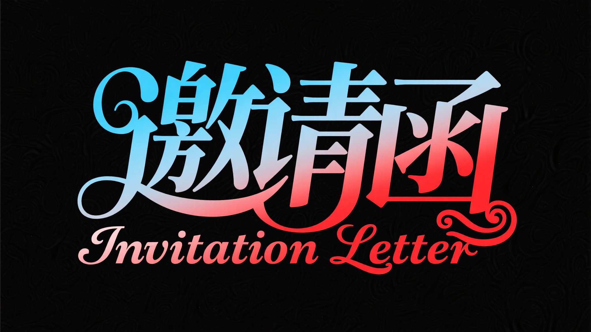 作品描述:渐变色彩 “邀请函” 艺术字,中文 “邀请函” 采用蓝到红的渐变效果,字体线条流畅且带有优雅的曲线装饰,下方英文 “Invitation Letter” 同样有色彩渐变,还搭配了红色的卷曲花纹元素,整体风格华丽浪漫,背景黑色,适合用于时尚、浪漫的活动邀请。