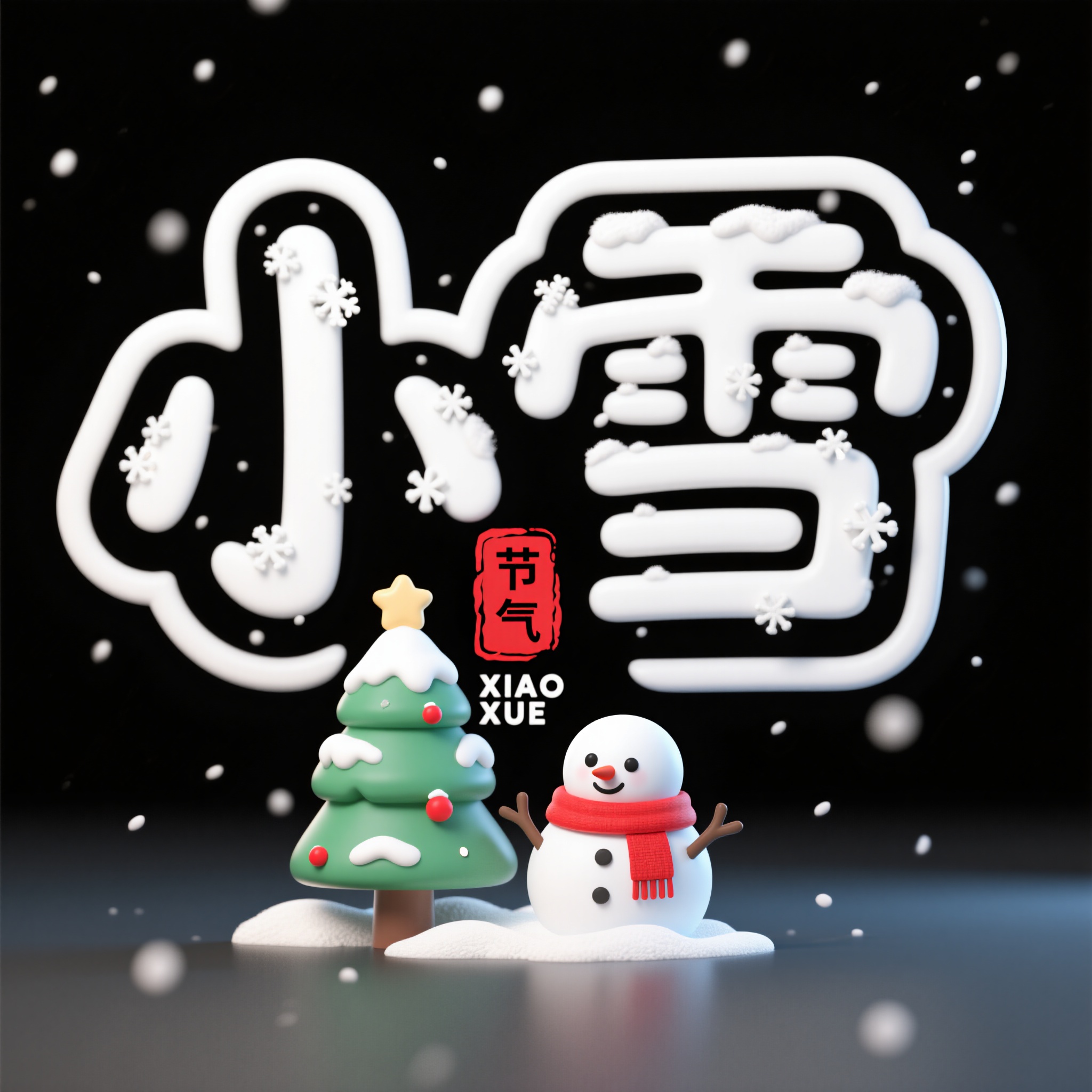 作品描述:3D 卡通风小雪艺术字,核心载体是黑底白边卡通艺术字 “小雪”(笔画带雪花颗粒质感),下方搭配戴红围巾雪人 + 装饰圣诞树,每秒 5 帧细雪飘落动效;中间有红底白字 “节气” 印章,英文 “XIAO XUE” 为黑色细体;背景纯黑色,营造卡通节气的互动趣味感。
