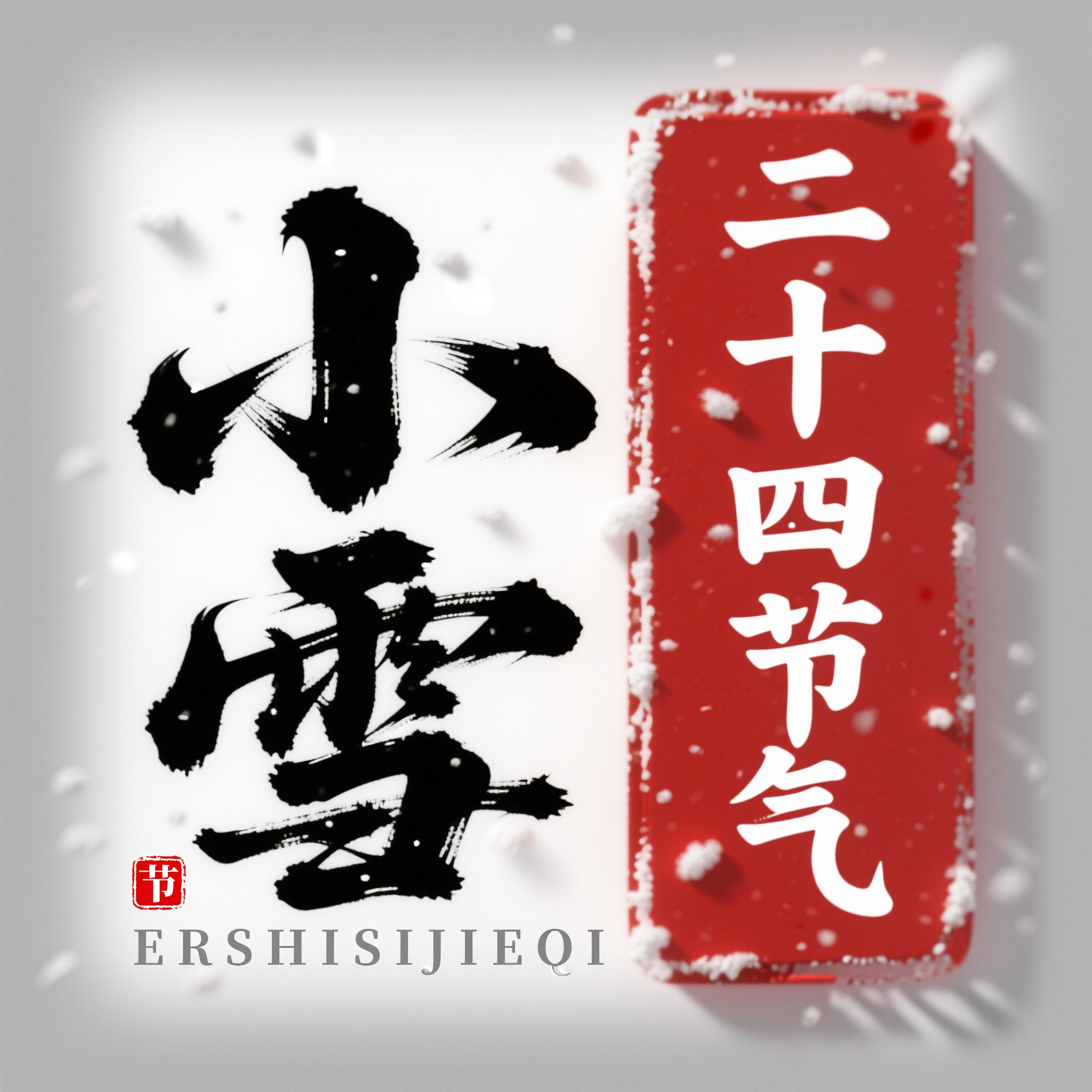 作品描述:3D 国风书法艺术字,核心载体是黑墨苍劲书法字 “小雪”(笔画带飞白、墨韵写实),右侧红底白字 “二十四节气” 竖排印章,左下角 “节” 字小红章;英文 “ERSHISIJIEQI” 为灰色细体;背景透明(或纯白),突出国风书法的雅致厚重感。