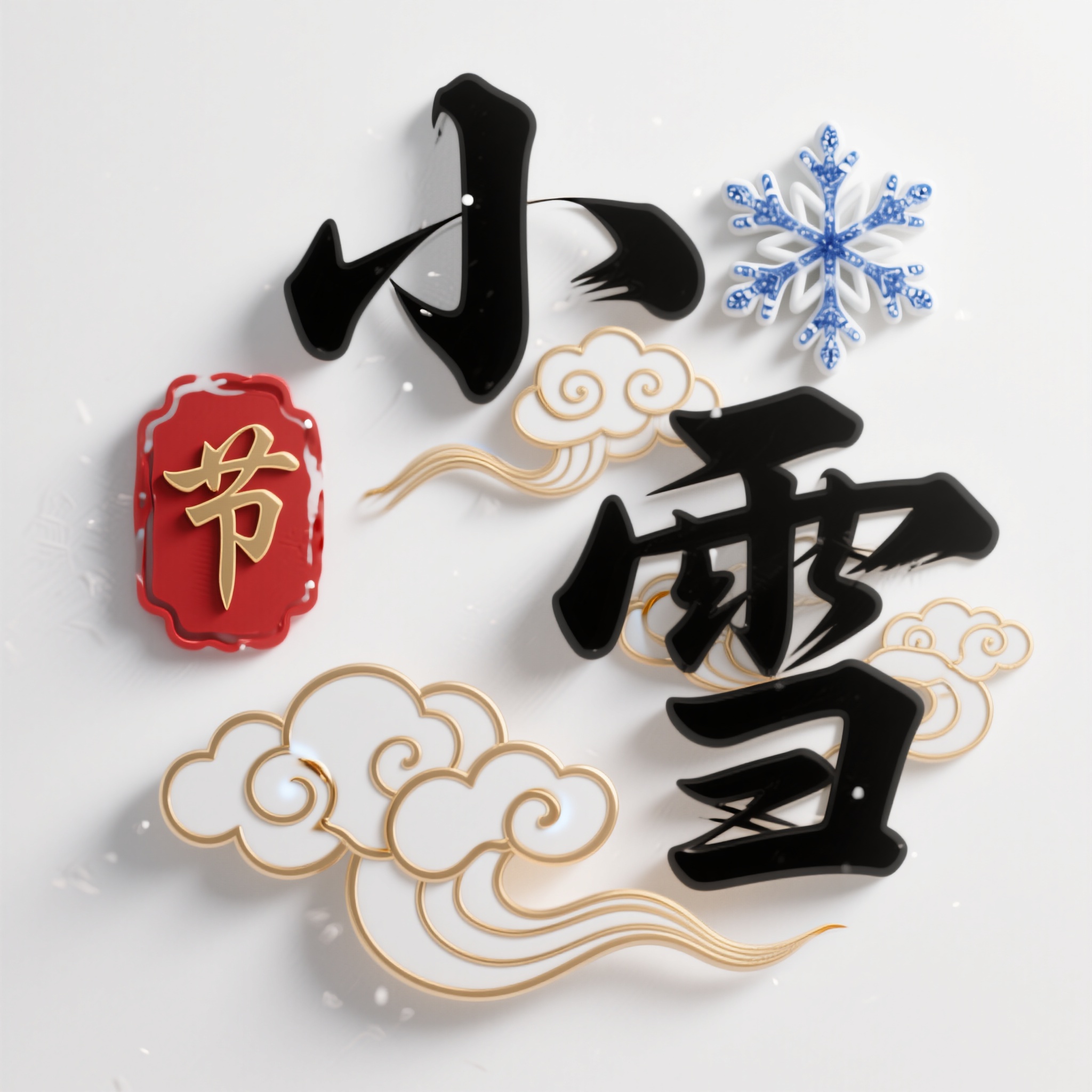 作品描述:3D 古风祥云艺术字,核心载体是黑墨艺术字 “小雪”(笔画缠绕淡金祥云纹饰),旁侧青花瓷风格雪花(每秒 6 帧旋转动效);左侧红底金字 “节” 字印章;背景白色,强化古风纹饰的传统韵味。
