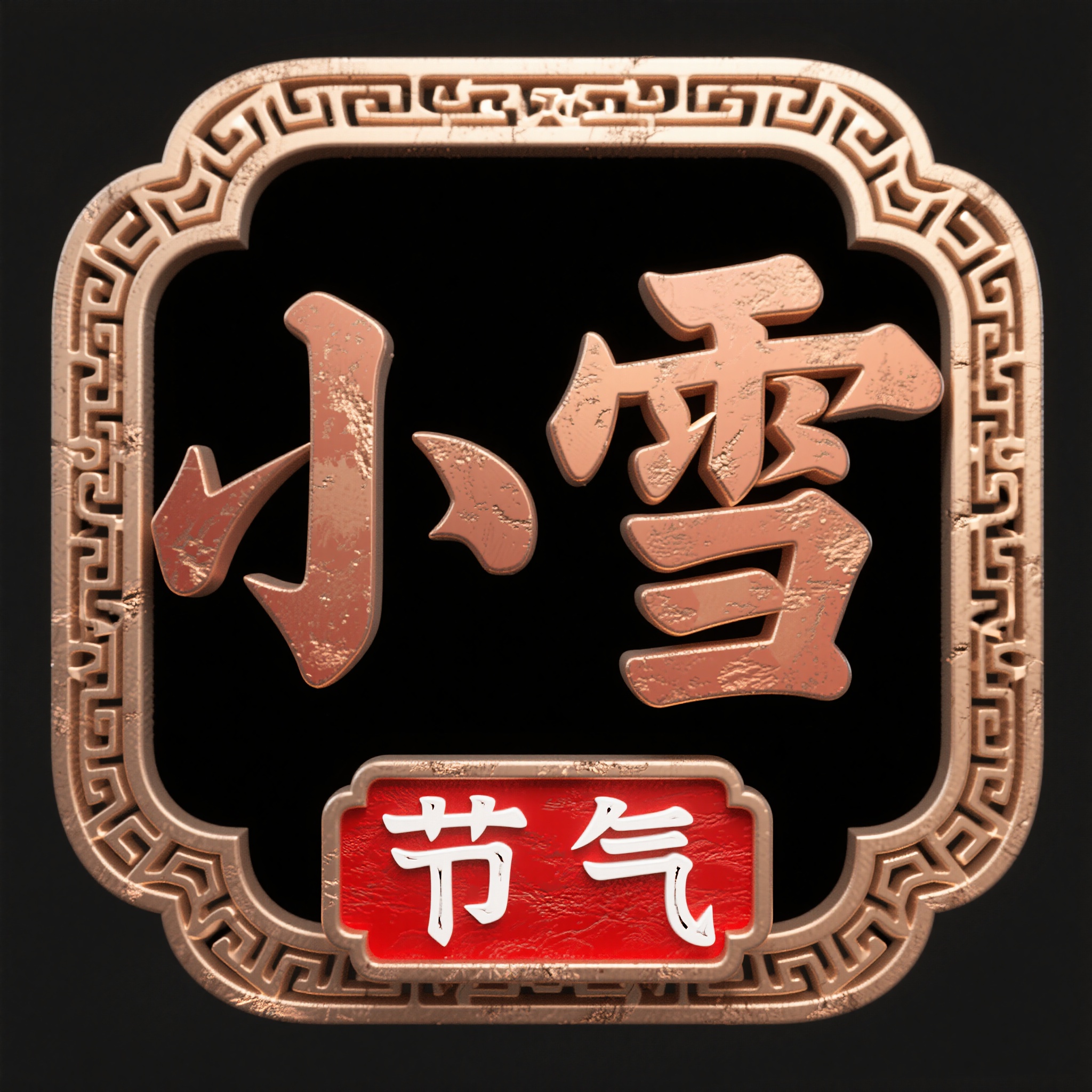 作品描述:3D 复古风艺术字,核心载体是棕红做旧艺术字 “小雪”(笔画带古铜印章纹理),周围复古纹饰边框;下方红底白字 “节气” 印章;背景黑色,方便抠图。