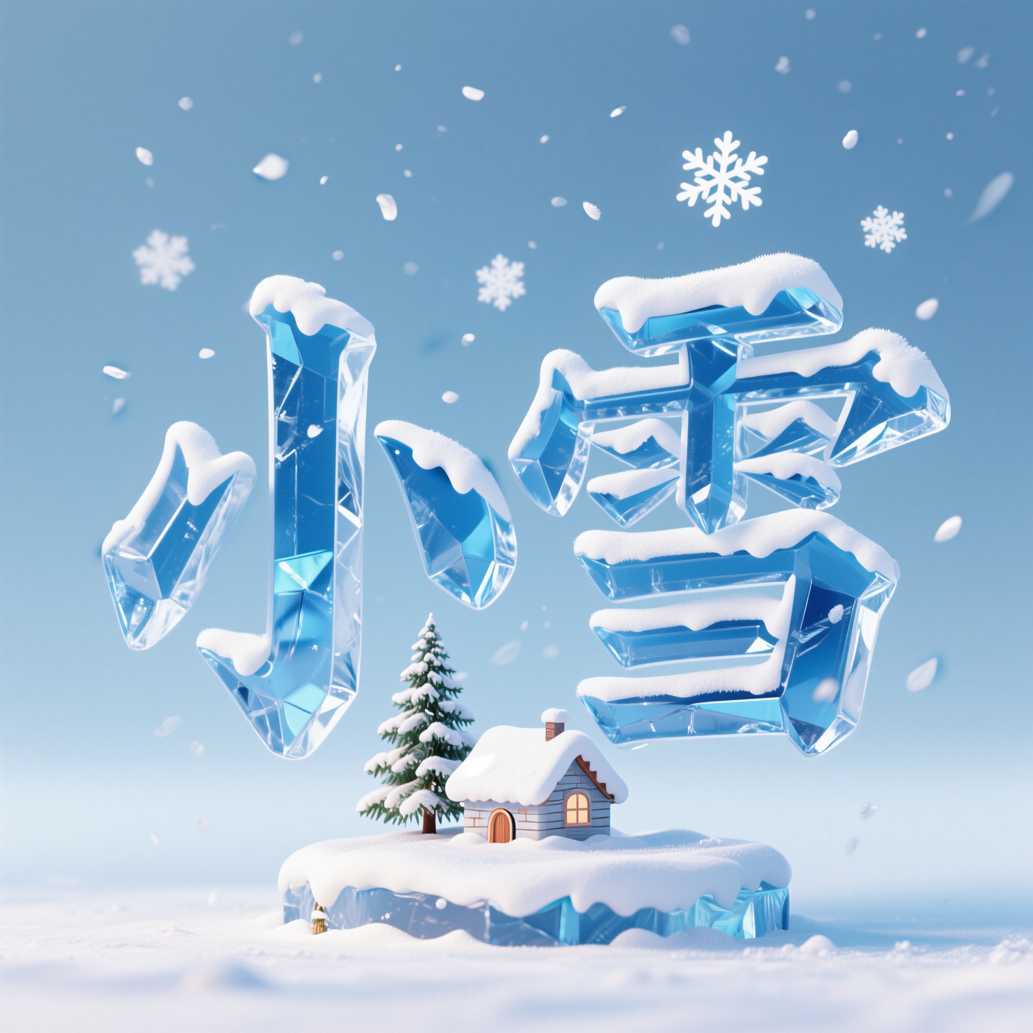 作品描述:3D 立体冰雪艺术字,核心载体是蓝白冰雕质感艺术字 “小雪”(笔画带冰棱反光细节),字内嵌入微型雪景(松树、雪屋);每秒 8 帧雪花从字顶飘落,背景淡蓝渐变,突出冰雪立体质感。