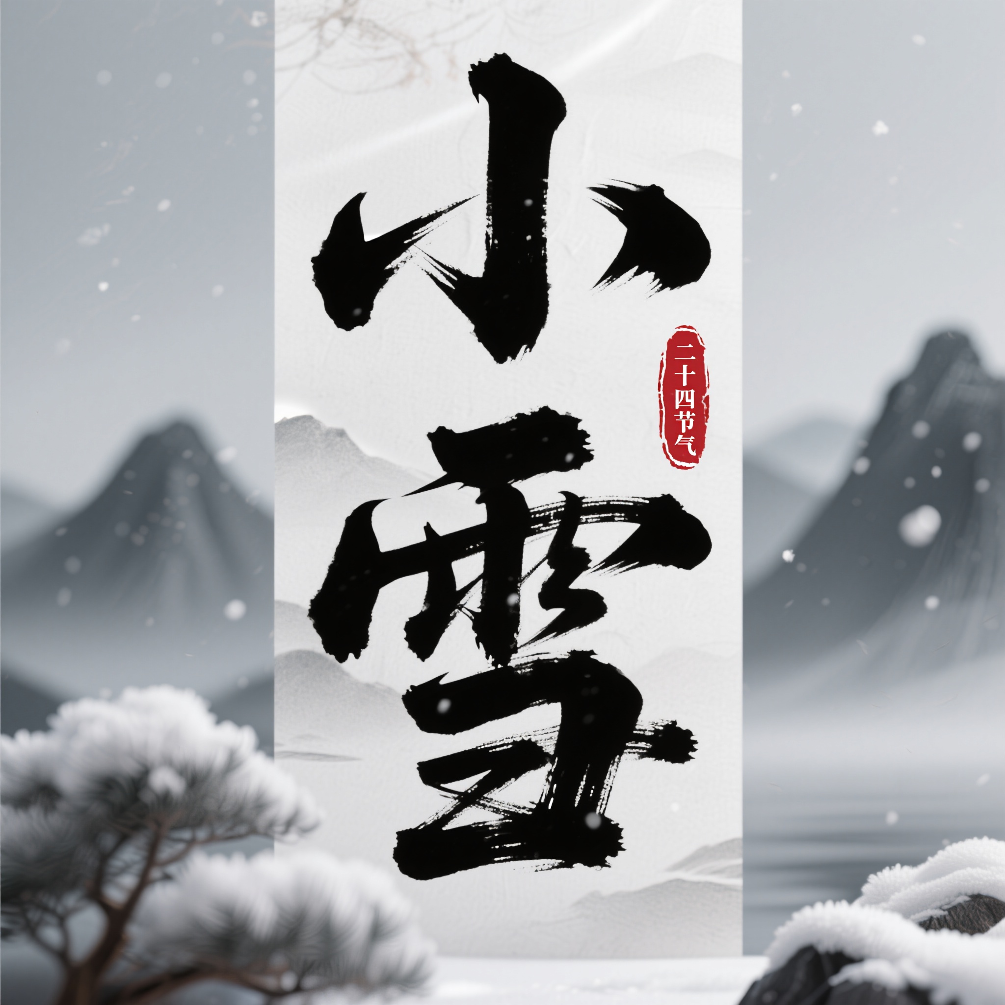 作品描述:3D 国风书法艺术字,核心载体是浓墨苍劲书法字 “小雪”(笔画飞白自然,如宣纸墨韵),右侧红底白字 “二十四节气” 篆刻印章;背景淡墨远山,突出国风雅致感。