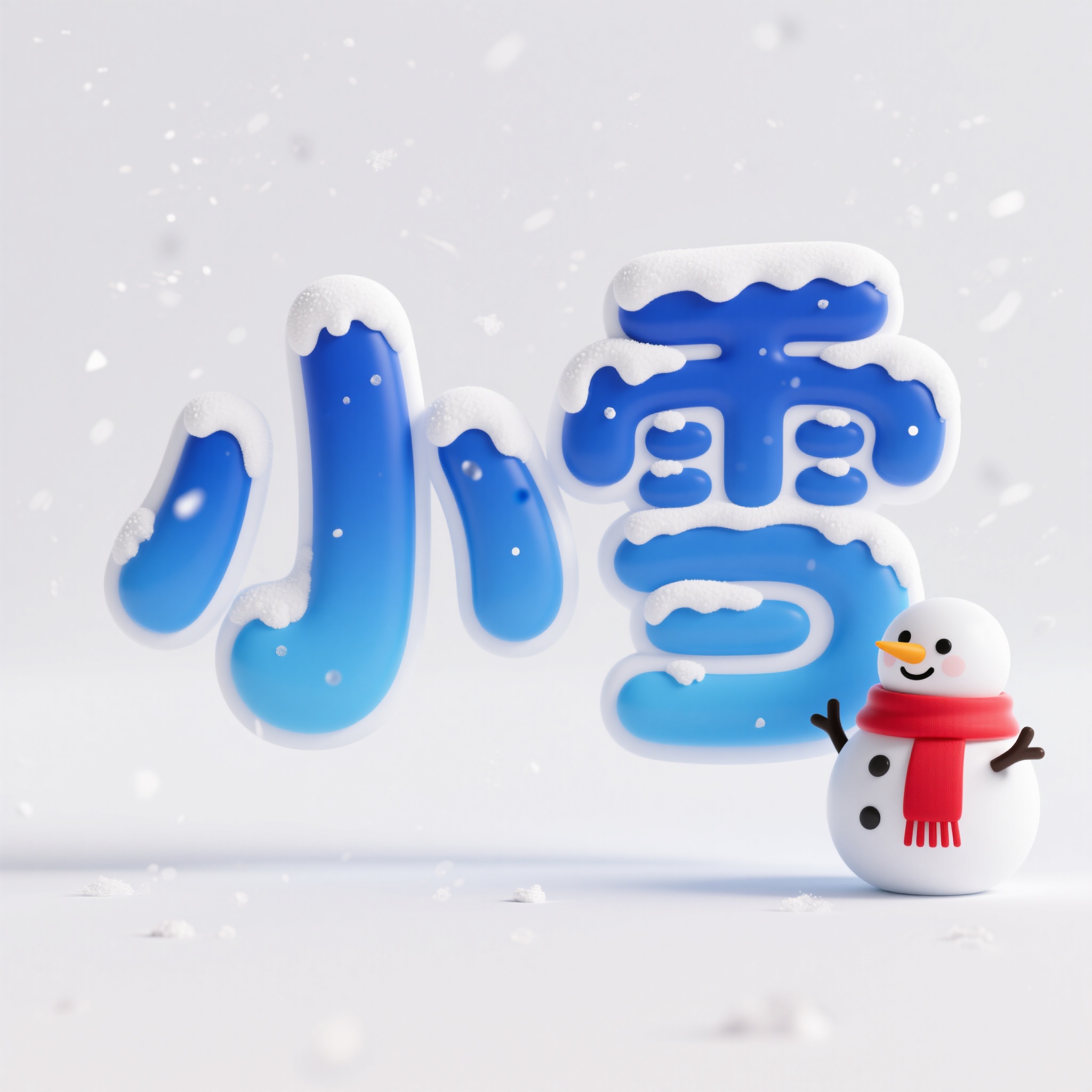 作品描述:3D 卡通风小雪艺术字,核心载体是蓝白渐变圆润卡通字 “小雪”(笔画带积雪颗粒质感),旁侧搭配戴红围巾卡通雪人,每秒 5 帧细雪飘落动效;背景纯白,营造童趣节气氛围。