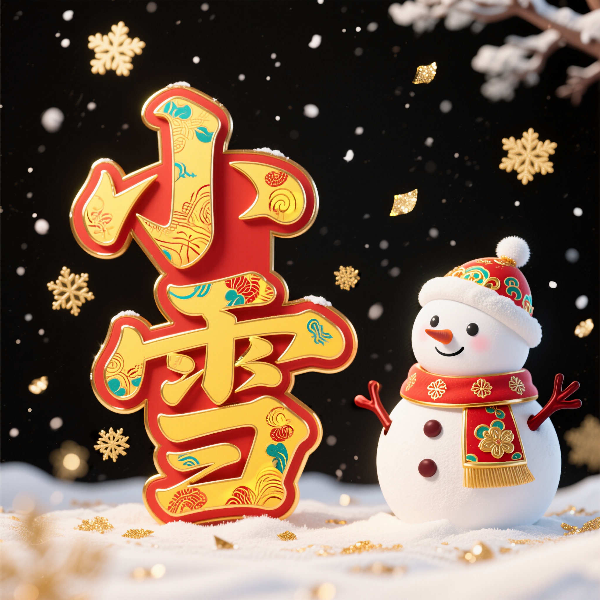 作品描述:3D 年画风艺术字,核心载体是红黄描金艺术字 “小雪”(笔画带年画纹理、金边装饰),旁侧年画风格雪人(红袍金饰);每秒 5 帧金粉雪花飘落,背景黑色,方便抠图