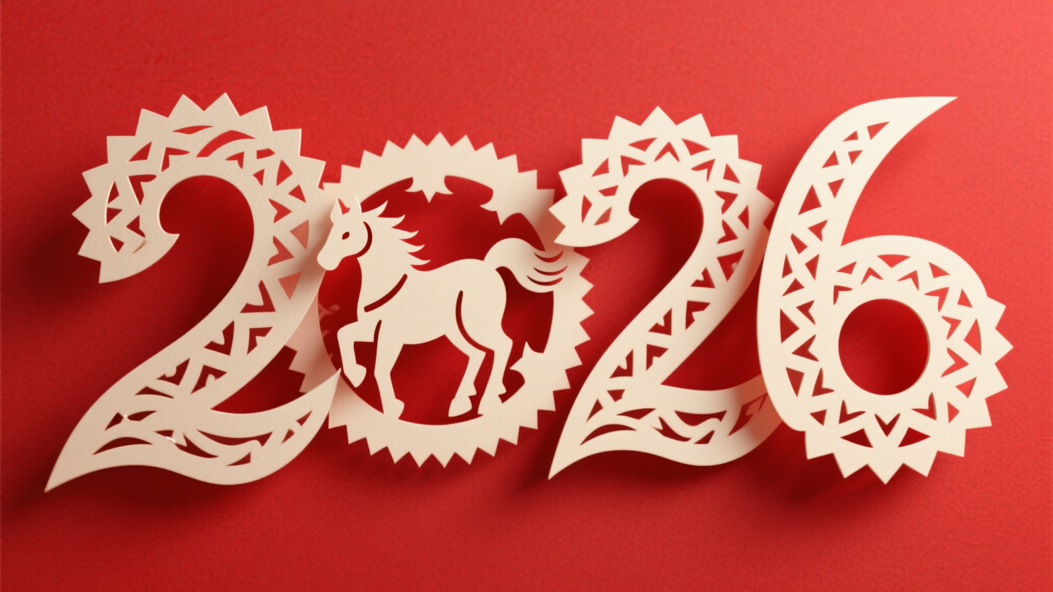 作品描述:3D 国风剪纸艺术字,核心载体是米白剪纸风格 “2026”(“0”“2” 融合马形镂空,边缘带剪纸锯齿纹理),红底哑光质感(如传统剪纸红纸);背景纯红