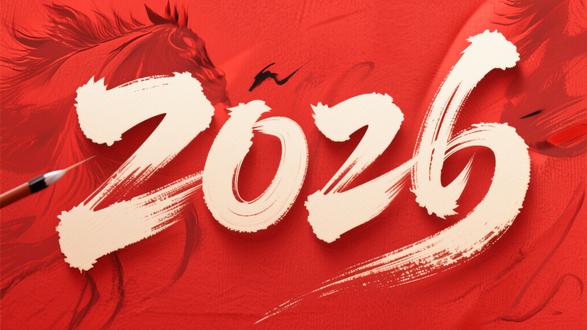 作品描述:3D 毛笔风艺术字,核心载体是米白毛笔飞白 “2026”(“0”“6” 笔画带马鬃飞白效果,笔锋如奔马疾驰),红底宣纸纹理;背景纯红,突出毛笔书法的大气与马年的灵动。