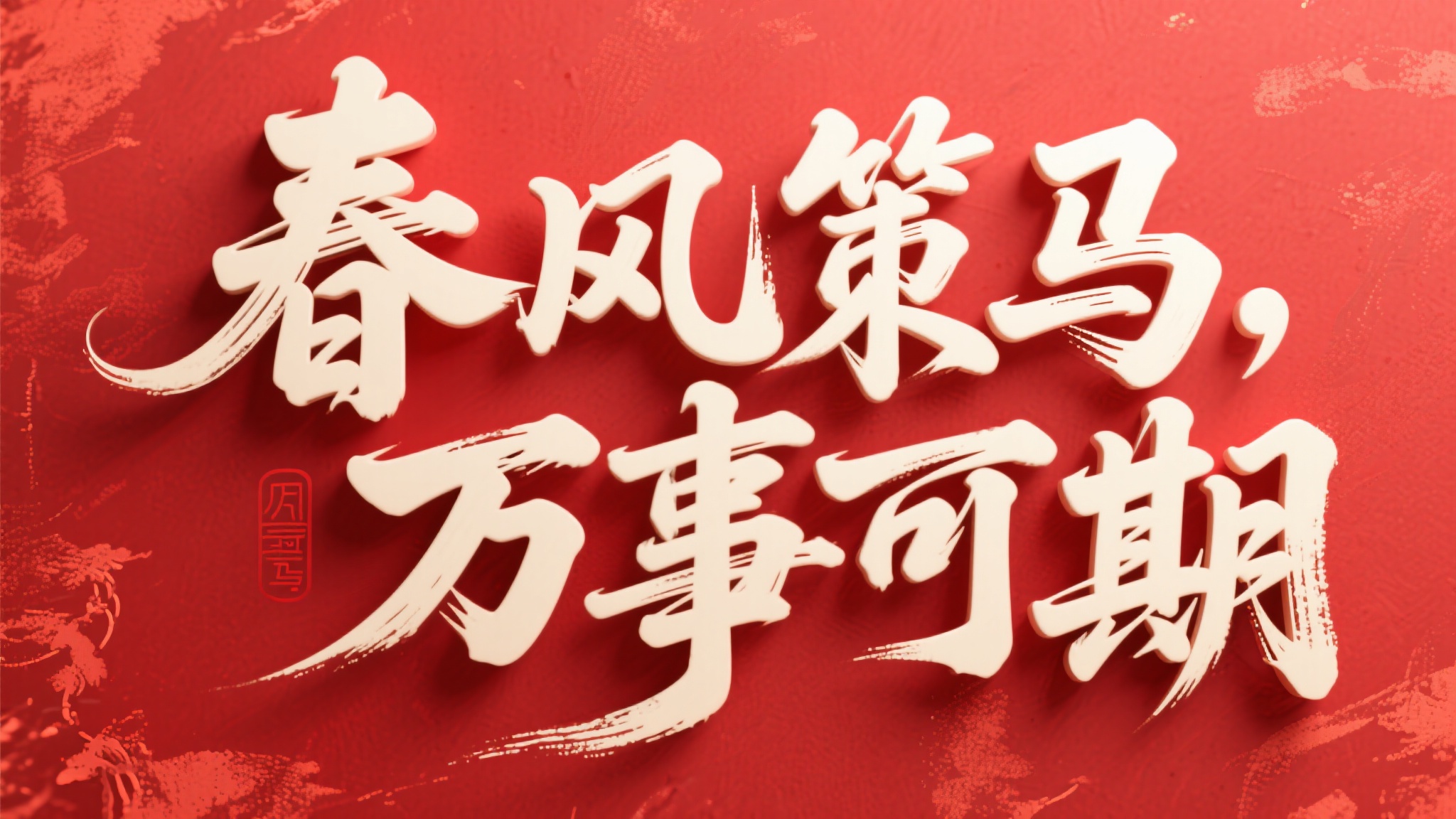 作品描述:3D 国风书法艺术字,核心载体是米白苍劲书法 “春风策马,万事可期”(笔画飞白自然,“马” 字笔锋具奔腾动感),红底做旧纹理(如传统红纸);背景纯红,突出马年新春的书法雅致与励志感。
