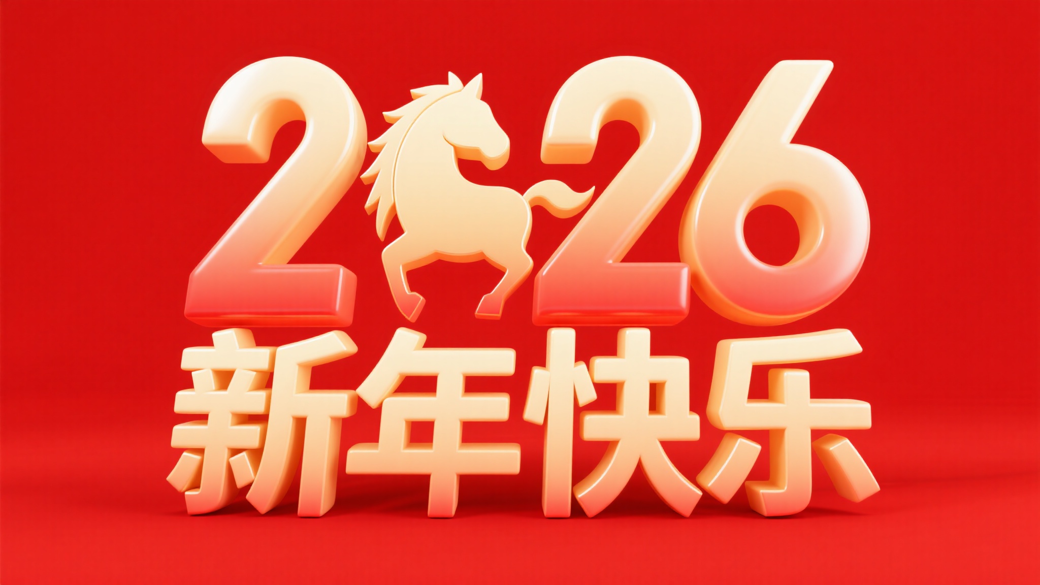 作品描述:3D 立体渐变艺术字,核心载体是米金渐变 “2026 新年快乐”(“2026” 笔画立体具层次感,“年” 字隐现马形),红底亮面质感;背景纯红,强化 2026 马年新年的立体喜庆感。