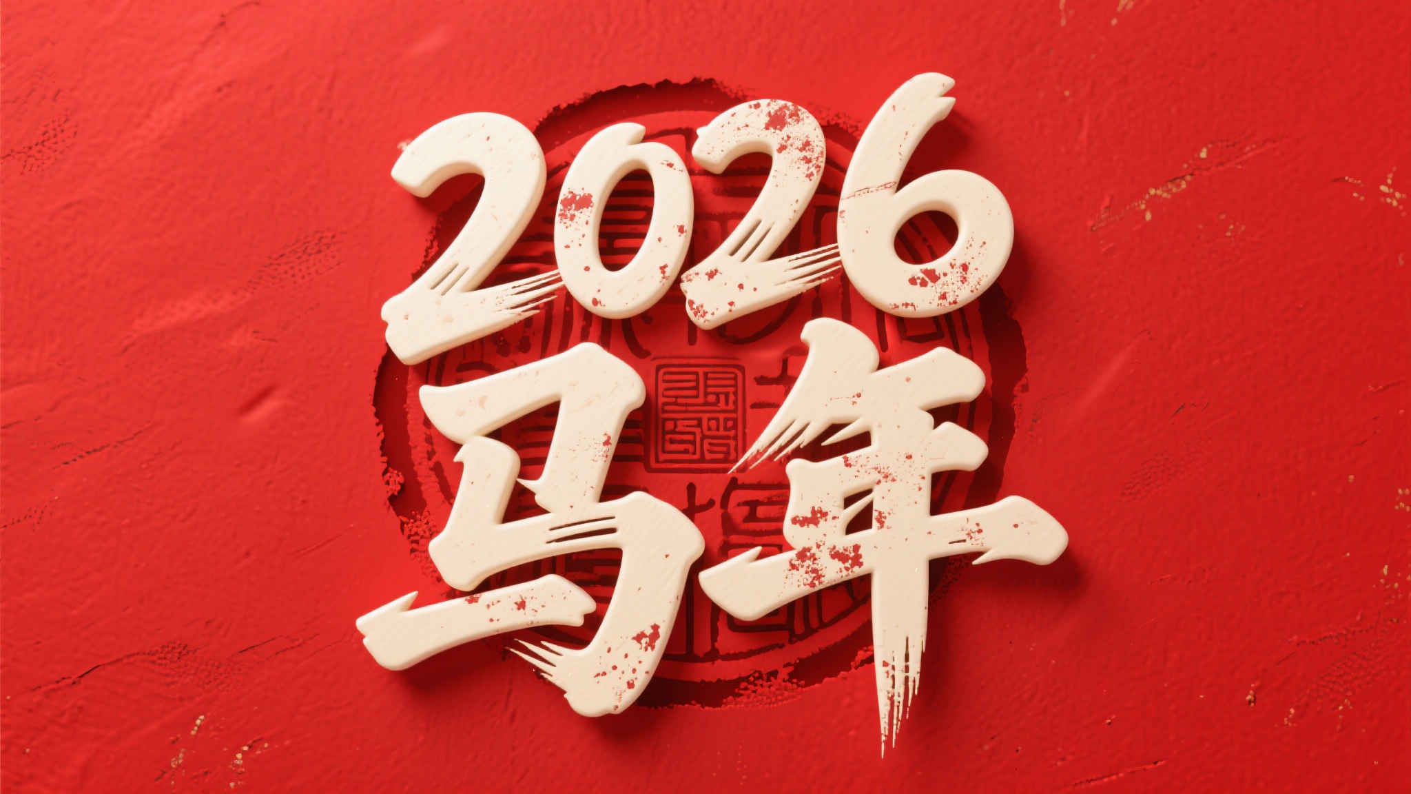 作品描述:3D 复古风艺术字,核心载体是米白 “2026 马年” 带印章斑驳感(“马” 字嵌入复古印章,笔画具岁月痕迹),红底做旧纹理(如传统印泥红纸);背景纯红,强化复古印章的马年怀旧年味。