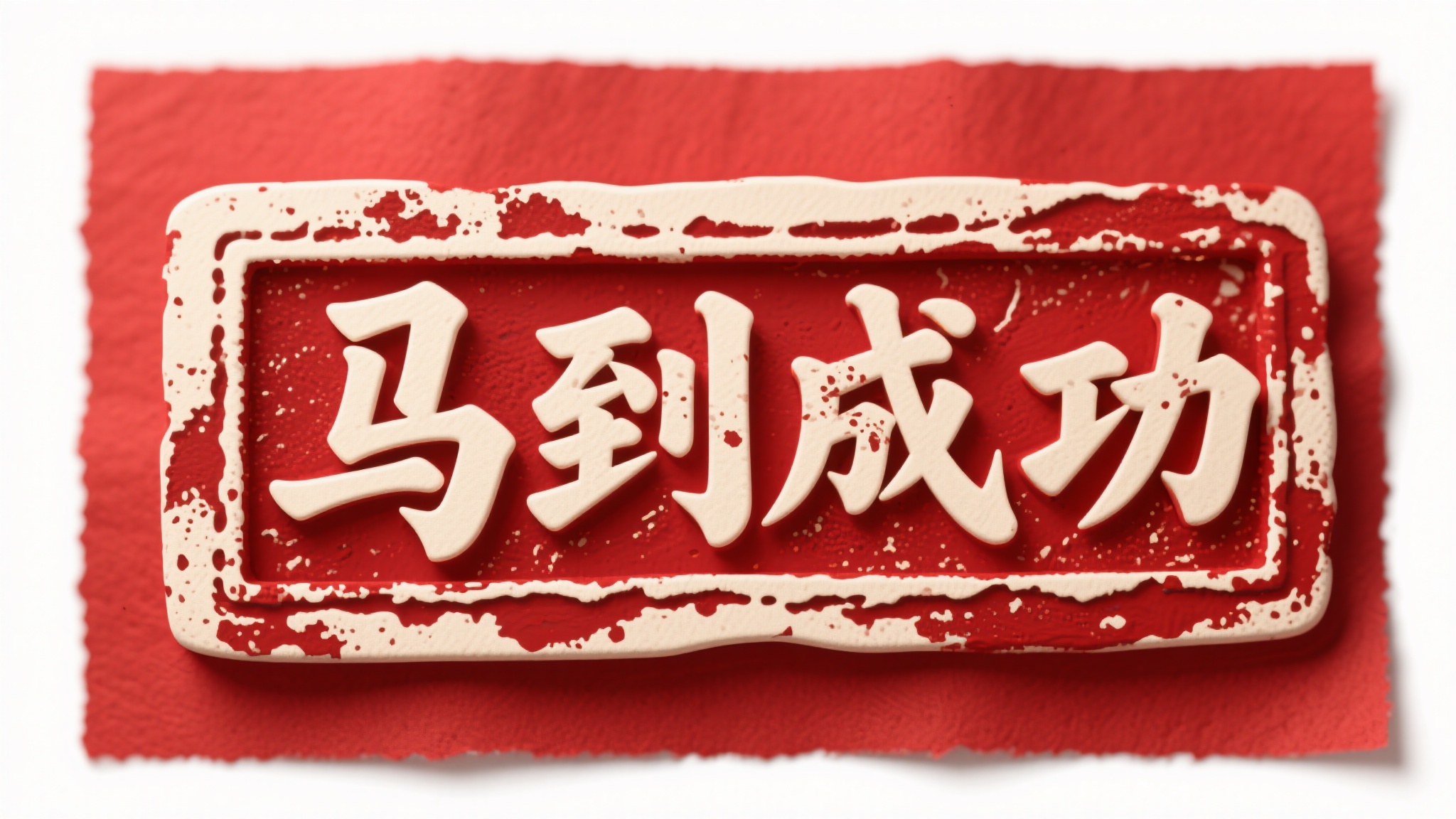 作品描述:3D 复古印章艺术字,核心载体是米白 “马到成功” 印章字(笔画带斑驳印泥痕迹,边缘做旧),红底哑光纹理(模拟传统印泥红纸);背景纯红,强化马年祝捷的复古印章年味。