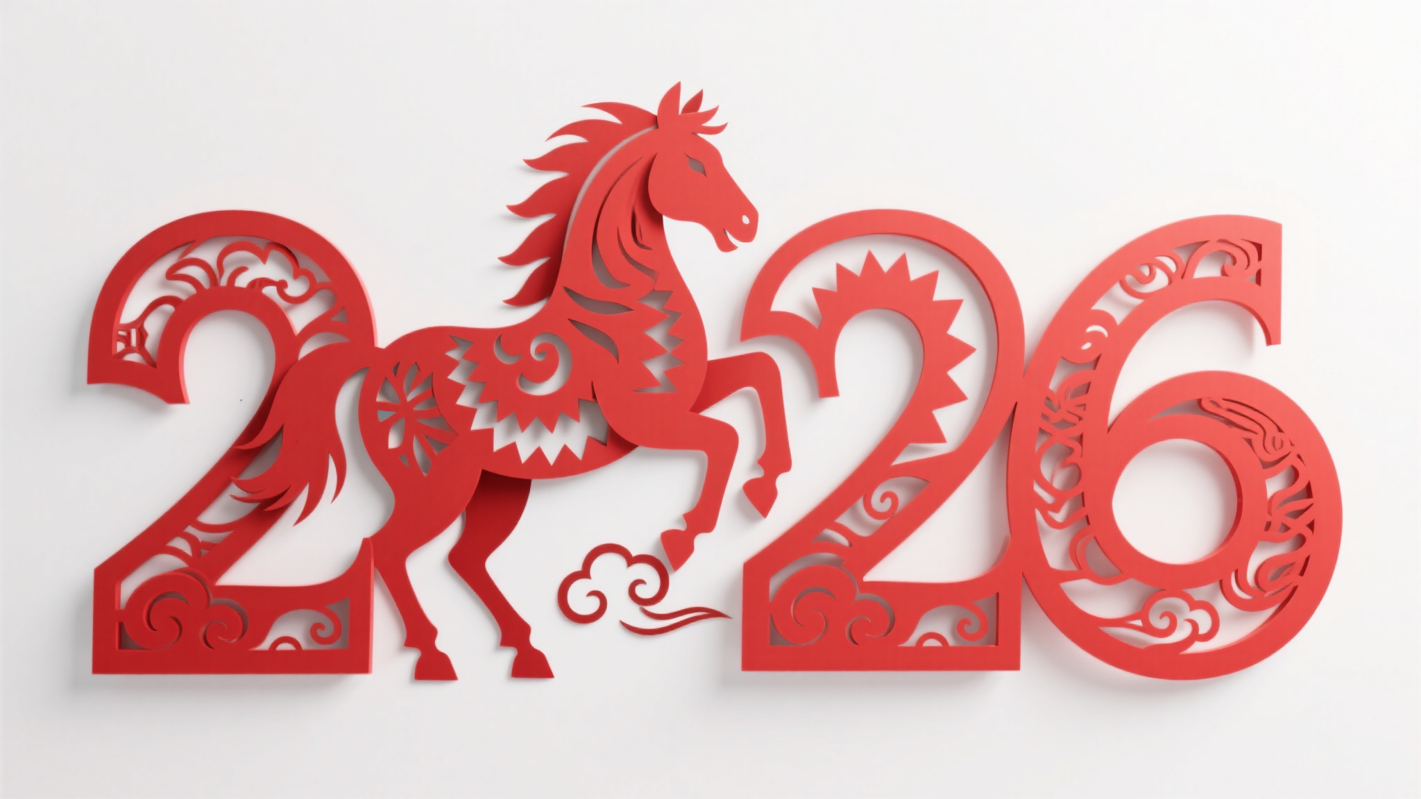 作品描述:3D 国风剪纸艺术字,核心载体是红色剪纸风格 “2026” 与马形镂空结合(数字与马身具剪纸锯齿边缘,点缀简约云纹细节);背景纯白,凸显国风剪纸的红字白背景喜庆雅致感。