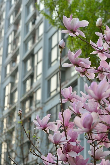 粉色的迎春花与住宅楼