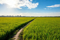 蓝天白云下的金色稻田小径