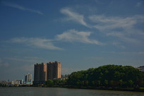宽幅碧水蓝天城市倒影全景
