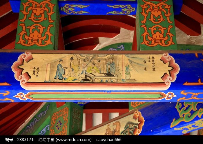 古建筑上彩绘的西凉王李暠人物形象和传统花纹图案图片