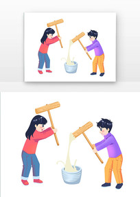 夜晚植物扫把下雪雪地里两个女孩堆雪人元素