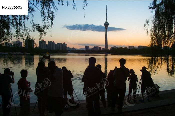 聚在一起拍摄电视塔日落的摄影爱好者