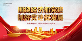 旗帜绸带山脉飞鸟华表大气党建红色背景
