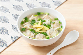 白瓷碗中盛放的馄饨汤点缀葱花和姜片