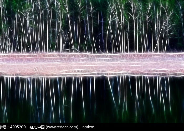 电脑画《湖岸桦林》