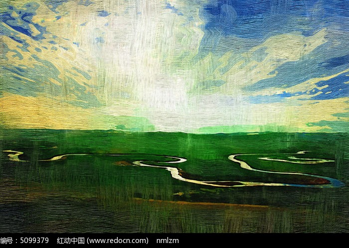 电脑油画《草原暮色河湾》