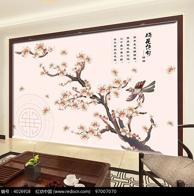 梅花小鸟中式电视背景墙图片下载_红动中国
